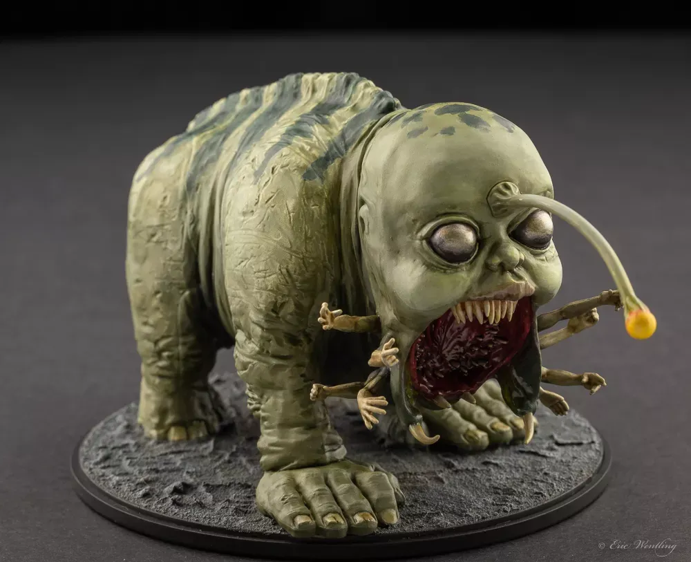 The timer expires. The ghosts of the cult chant, “COME, DEMON, WE AWAKEN THEE.” The pile of refuse blasts open, dealing enough damage to Oonagh to kill her instantly. She flies across the room, her spine snapping as she crashes into the altar. And this emerges from the pile of refuse.